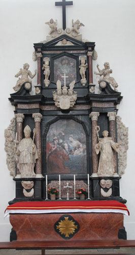 Wie beim Gegenüber findet sich auch hier reichlicher Schmuck mit vergoldeten Schnitzereien wie Kapitellen, Schmuckrahmen und filigranem Rankenwerk auf den beiden seitlichen Stücken des weit auseinander gesprengten Segmentbogengiebels und auf dem oberen Abschluß des Altarauszuges. Auch das Schleifras-Wappen ist bei diesem Paar besonders detailliert herausgearbeitet, wie man an den feinen Details der Bügelhelme, den Verzierungen der Inful, den Troddeln des Kissens auf dem mittleren Helm, dem Schwertgriff, der Rosette in der Krümme des Abtsstabes und an vielen anderen atemberaubend feinen Details sehen kann (Detail-Abb. unten). Alle drei Holz-Altäre in den Seitenschiffen des Langhauses wurden erst 1714 vollendet, und die Altäre des Martinus und des Krispin und Krispinian sind die spätesten.