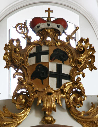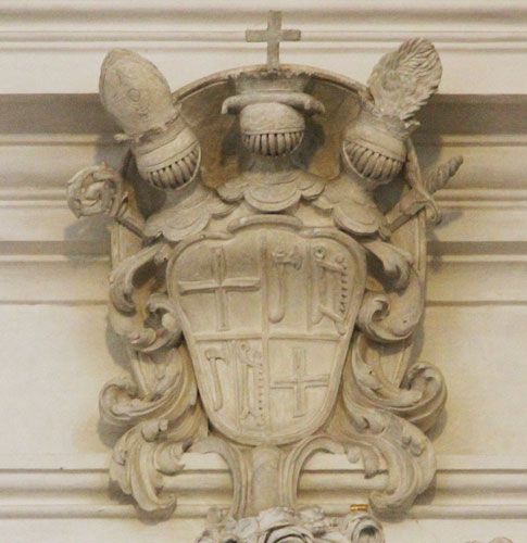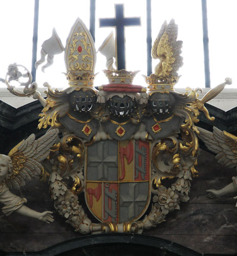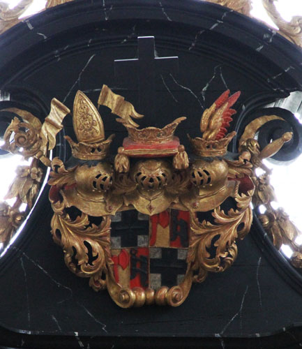 Zwischen den beiden mittleren der vier raumgreifenden Volutenbögen ist das Wappen des Bauherrn eingepaßt, vollständig mit komplettem Oberwappen, bis ins letzte Detail der aus der Mitra hervorkommenden Fähnchen korrekt ausgeführt und bemalt.