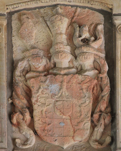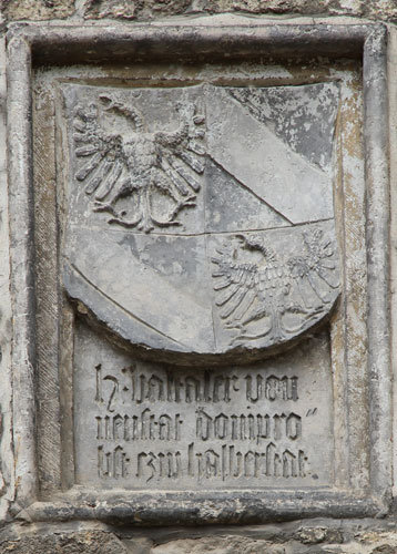 Ab der Mitte des 16. Jh. erfolgte der weitere Ausbau. Der damalige Administrator war Sigismund von Brandenburg, der die Bistümer Magdeburg und Halberstadt leitete. Sein Wappen sehen wir zweimal, einmal in der Tordurchfahrt seitlich in die Wand eingelassen und einmal am Hauptgebäude, zusätzlich mit dem seines Hofmeisters. Im Hof (Abb. oben) sehen wir das besser erhaltene landesherrliche Wappen für Sigismund (Sigmund) Markgraf von Brandenburg (2.12.1538-14.9.1566), den Sohn von Joachim II. Kurfürst von Brandenburg (9.1.1505-1571) aus dessen Ehe mit seiner zweiten Frau, Jadwiga von Polen (25.3.1513-7.2.1573).