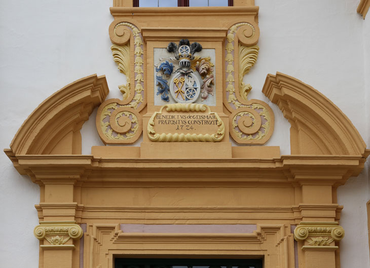Das über dem Inschriftenstein angebrachte Wappen ist wie am Türkentor für den Abt Coelestin von Geismar (1.11.1666-20.12.1718), der 1706-1718 amtierte und 1714-1718 Präsident der Bursfelder Kongregation war. Sein Wappen folgt im Aufbau dem oben beschriebenen für seinen Verwandten. Auch hier sind die Felder 2 und 3 für das Familienwappen nicht durchgängig korrekt tingiert, nur der untere Teil stimmt. Geschweifte Ornamente rahmen die ovale Kartusche ein, die von einer Inful überhöht wird. Hinter der Kartusche stehen zwei Abtsstäbe und schräglinks das gestürzte Schwert.