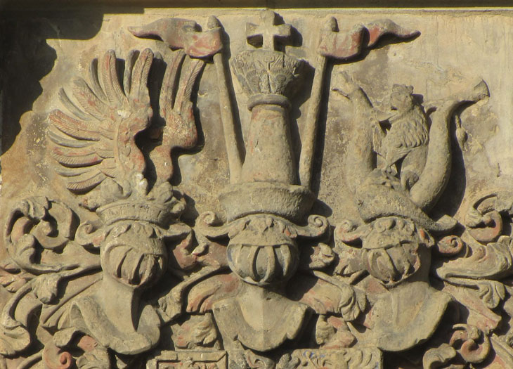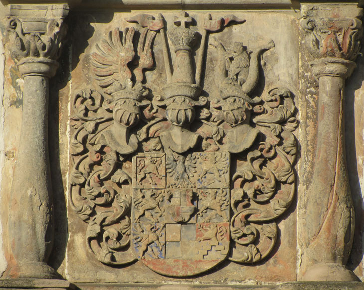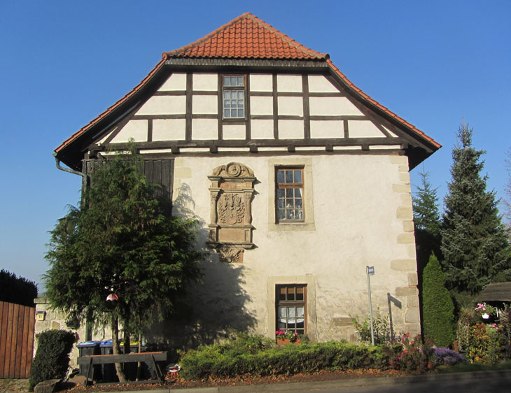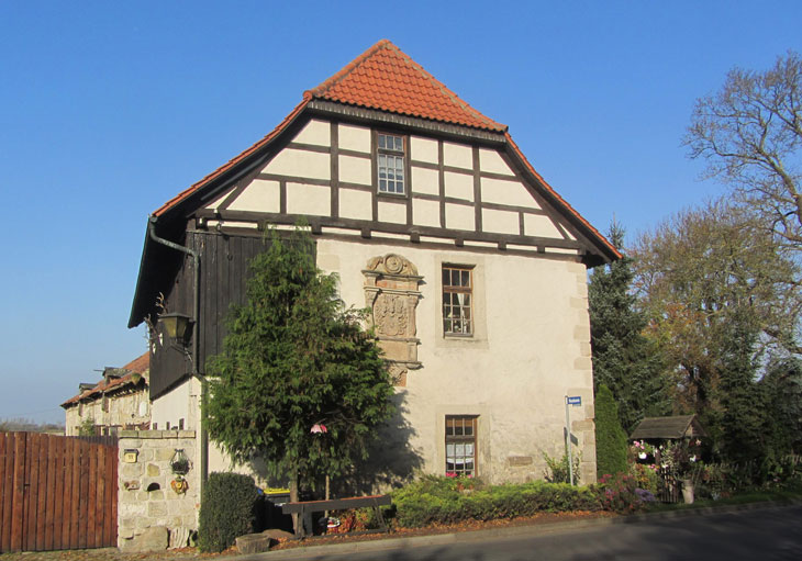Dieses Wappen gibt es in genau dieser Form in der Nähe noch dreimal, und zwar einmal am Petershof in Halberstadt über dem Renaissance-Portal, und zweimal an Schloß Krottorf, einmal im Tordurchgang, aber schlechter erhalten als das in Neudamm, und einmal am Hauptgebäude zum Innenhof hin.