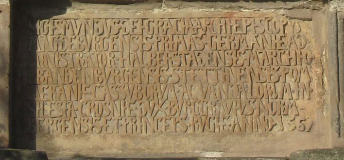 In der Sockelzone ist eine erhabene Kapitalis-Inschrift herausgearbeitet mit dem Wortlaut: "SIGISMVNDVS DEI GRACIA ARCHIEPISCOPVS / MAGDEBVRGENSIS PRIMAS GERMANI(A)E AD/MINISTRATOR HALBERSTADENSIS MARCHIO / BRANDENBVRGENSIS STETTINENSIS POM/MERANI(A)E CASSVBORVM AC VANDALORVM IN / SILESIA CROSNI(A)E DVX BVRGGRAVIVS NORM/BERGENSIS ET PRINCEPS RVGI(A)E ANNO 1562" - Sigismund von Gottes Gnaden Erzbischof von Magdeburg, Primas von Germanien, Administrator von Halberstadt, Markgraf von Brandenburg, Herzog von Stettin, von Pommern, der Kaschuben und Wenden, in Schlesien zu Crossen, Burggraf von Nürnberg und Fürst von Rügen, im Jahre 1562 (die "2" sieht zwar aus wie eine "7", das wäre jedoch aufgrund der Lebensdaten nicht möglich). Einige Stellen zeigen Nachlässigkeiten, z. B. die abgekürzte Genitiv-Endung "e" statt "ae", "Gracia" statt "Gratia" oder "Normbergensis" statt "Norinbergensis"; ähnliche Verschleifungen sind in Schloß Krottorf zu lesen.