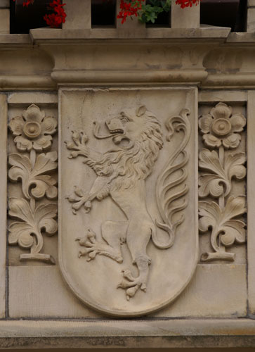 An den beiden die Giebelfassade flankierenden Erkern befinden sich zwei weitere Wappen. Wir sehen dort das mittlere Wappen von Hannover als preußische Provinz, in Rot ein laufendes silbernes Pferd, von einer Herzogskrone überhöht. Das Königreich Hannover, das den niedersächsischen Raum weitestgehend beherrscht hatte, wurde nach dem preußisch-österreichischen Krieg und der Kapitulation der hannoverschen Armee nach der Schlacht bei Langensalza laut Gesetz vom 20.8.1866 und gemäß Besitzergreifungsurkunde vom 2.10.1866 von Preußen "für immer" annektiert, ein Schicksal, das Hannover mit Kurhessen, Nassau und Frankfurt teilte. König Georg V. mußte ins Exil gehen. Nach 7 Jahrhunderten welfisch geprägter Selbständigkeit im Reich wurde es ein von einem Oberpräsidenten geleiteter Teil Preußens, und die lüneburgischen Löwen des braunschweig-lüneburgischen Wappens fanden Eingang in das königlich-preußische Staatswappen. Als preußische Provinz führte Hannover ein größeres, ein mittleres und ein kleineres Wappen, alle "befreit" von allen bisherigen Territorial- und Anspruchswappen, reduziert auf das Welfenroß in verschiedener Ausgestaltung.