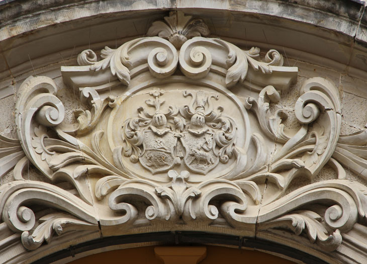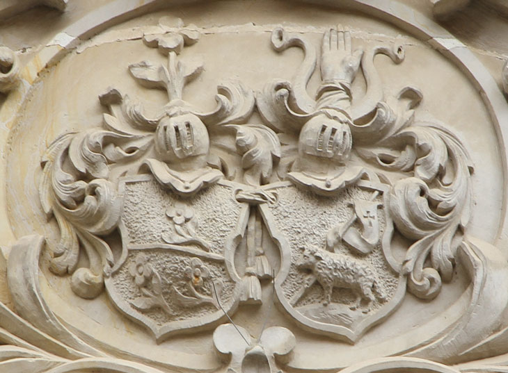 Das zweite Wappen für die Ehefrau des Bauherrn zeigt auf einem Boden oder einem Hügel ein Lamm, das eine mit einem schwebenden Kreuz belegte Fahne an einer schräglinks gerichteten Stange mit dem rechten Vorderfuß hält, auf dem Helm ein wachsender rechter Unterarm zwischen zwei Büffelhörnern (ohne Literaturbeleg, Tinkturen unbekannt). Die Wappen wiederholen sich noch einmal im Innern des Hauses; das Wappen mit dem Lamm und der Fahne ist als Vollwappen im Stuck des Musikzimmers unter dem oben erwähnten Trommler dargestellt.