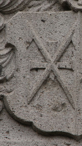 Hier taucht das Zeichen für das Erztruchsessenamt auf - die Pfalzgrafen waren Erztruchsessen bis 1623, sowie 1706-1744. Sie waren 1648 bis 1706 Inhaber des Erzschatzmeisteramtes. Die Pfalzgrafen hatten zwar anläßlich ihrer Rehabilitierung nach dem Westfälischen Frieden das Erzschatzmeisteramt bekommen, doch das Erztruchsessenamt war verloren. In Zeiten, in denen den Pfalzgrafen die Nutzung des Reichsapfelschildes versagt blieb, griffen sie ersatzweise auf den Regalienschild zurück, wie das z. B. für den gleichen Wappenträger an der Heiliggeistkirche in Heidelberg realisiert ist.