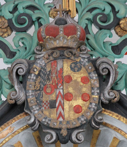 Johann Wilhelm Joseph Kurfürst von der Pfalz hatte in erster Ehe am 26.10.1678 in Wiener-Neustadt Maria Anna Josepha Erzherzogin von Österreich (1654-1689) geheiratet. Beide Kinder aus dieser Ehe starben am Tag ihrer Geburt. In zweiter Ehe heiratete er am 22.4.1691 in Florenz Anna Maria Louise Prinzessin de Medici (11.8.1667-18.2.1743), die Tochter von Cosimo III. de Medici Großherzog von Toscana (1642-31.10.1723) und Marguerite Louise Mademoiselle d'Orléans (28.7.1645-17.9.1721). Sie war die Schwester von Giovanni Gastone de Medici Großherzog von Toscana (24.5.1671-9.7.1737), der 1723 als Großherzog nachfolgte, aber keine Kinder hatte und mit dem die regierende Linie erlosch, woraufhin das Lehen vom Kaiser an Franz Stephan von Lothringen vergeben wurde. Anna Maria Louise Prinzessin de Medici führt in Gold sechs 1:2:2:1 gestellte Kugeln (palle), von denen die obere etwas größer ist und blau tingiert sowie mit drei (2:1) goldenen Lilien (Fleur-de-Lys) belegt ist, und die fünf unteren rot sind. Die Änderung der obersten Kugel war ein französisches Gnadenzeichen, denn die oberste Kugel ist praktisch mit dem Wappen von Frankreich belegt. Eine Fleur-de-Lys führt die Stadt Florenz ebenfalls in ihrem Wappen, aber in rot und modifiziert; den de Medici wurden die Fleur-de-Lys - Lilienblüten - u. a. durch ein Privileg von 1465 vom französischen König Ludwig XI als Gnadenzeichen gewährt (Wappenbesserung).