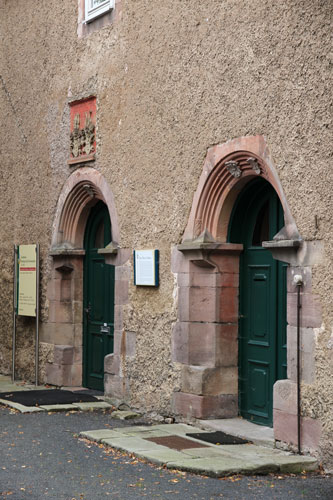 Der zum Schloßpark hin ausgerichtete Eingang, ein Portal des 19. Jh., trägt einen bauzeitlichen, auf das Jahr 1560 datierten Wappenstein. Dehio gibt als Baujahr 1607 an, das kann am Bau jedoch keine Bestätigung finden und ist vermutlich eine Verwechslung mit Nebengebäuden. Das Allianzwappen zeigt heraldisch rechts das Wappen der von Ebersberg gen. Weyhers (in Blau eine silberne Lilie, , auf dem gekrönten Helm mit blau-silbernen Decken ein blauer, beiderseits mit einer silbernen Lilie belegter Flug) und auf der anderen Seite das bei Großmann als "rechts nicht identifiziert, eventuell Geysa, Sturm, Altkreis Fulda, 1989, S. 299)" verzeichnete Wappen, das als dasjenige der von Schrimpf bzw. von Berg gen. Schrimpf identifiziert werden kann, das bereits am Oberen Schloß als Schild am rechten Portalbogen zu sehen war, nun als Vollwappen: in Blau ein in zwei Reihen silbern-rot geschachter Balken, auf dem Helm mit blau-silbernen Decken ein wie der Schild bez. Paar Büffelhörner. Das Wappen wird beschrieben im Siebmacher Band: SaAE Seite: 20 Tafel: 15, Band: ThüA Seite: 44 Tafel: 34 und bei Schöler, Familienwappen S. 31, Tafel 13. Rietstap listet es wie folgt: "D'azur à la fasce échiquetée d'argent et de gueules. Casque couronné. Cimier deux proboscides aux armes de l'écu. Lambrequin d'argent et d'azur".