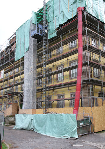 der baufällig gewordene sechsgeschossige Wohnturm, der seine