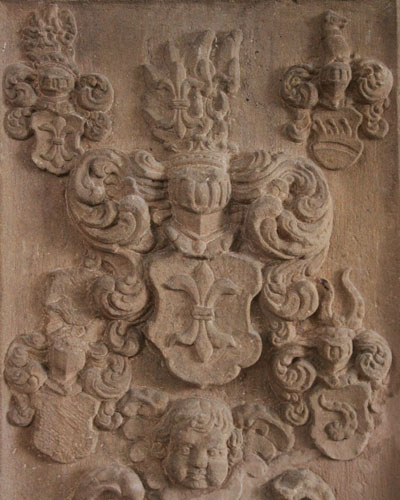 Abb.: Wappenpaar, Seite des Ehemannes, oben. Links vermutlich von Ebersberg, rechts vielleicht von Fuchs.