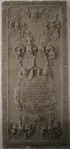 5.) Die Grabplatte für Ritterrat Lucas von Ebersberg gen. Weyhers (18.12.1581-3.1.1657) ist mit folgender Inschrift versehen: "IM IAHR CHRISTI 1657 DEN 3. IANV(AR) IST DER REICHSFREY HOCHEDEL GEBOHRNE HERR LVCAS VON EBERSBERGK GENANDT VON WEYHERS RITTERRATH (I)N GOTT SEELIG ENTSCHLAFFEN (SEINES ALTE)RS 74 IAHR(E) 15 TAG(E) DES(S)EN SEEL(E) GOTT GN(A)EDIG SEIE AMMEN". Im unteren Bereich des Zentralfeldes ist eine weitere Inschrift religiösen Inhalts angebracht. Vanitas-Symbole wie ein Röhrenknochen und ein Totenschädel, aus dem Würmer kriechen, illustrieren ganz unten die Vergänglichkeit des menschlichen Körpers. Im oberen Bereich befinden sich fünf Vollwappen, eines in der Mitte und vier außen herum. Das zentrale, größer dargestellte Wappen ist dasjenige der von Ebersberg gen. Weyhers, in Blau eine silberne Lilie, auf dem gekrönten Helm mit blau-silbernen Decken ein blauer, beiderseits mit einer silbernen Lilie belegter Flug. Das Wappen wiederholt sich in der rechten oberen Ecke. Links oben sehen wir das Wappen der von Rüdigheim, golden-rot dreimal im Bogen geteilt, die oberste Teilung besetzt mit drei gestielten Rosen (?), auf dem Helm ein wachsender Rüdenrumpf mit Halsband (mehrere Varianten im Aschaffenburger Wappenbuch). Rechts unten das Wappen ist zerstört; zu erwarten wäre dasjenige der von Buchenau, in Gold ein golden gekrönter grüner Sittich mit rotem Halsband, auf dem Helm mit grün-goldenen Decken ein wachsender, auffliegender golden gekrönter grüner Sittich mit rotem Halsband und goldenen Flügeln (so nach dem Aschaffenburger Wappenbuch). Der Sittich ist auf dem Helm zu erkennen. Das vierte und letzte Ahnenwappen links unten gehört zur Familie von Fechenbach, in Silber ein schwarzes Steinbockshorn, auf dem Helm mit schwarz-silbernen Decken ein silbern-schwarz übereck geteiltes Paar Büffelhörner (nach dem Aschaffenburger Wappenbuch). Diese vier Wappen werden durch folgende genealogischen Zusammenhänge erklärt: Lucas von Ebersberg war der Sohn von Hammann (Hermann) Bernhard von Ebersberg gen. Weyhers (-1587) zu Haselbach, und Dorothea von Rüdigheim. Seine Großeltern väterlicherseits waren Lucas von Ebersberg gen. Weyhers zu Haselbach und Barbara von Buchenau; seine Großeltern mütterlicherseits waren Hammann von Rüdigheim und Regina von Fechenbach (alle Genealogien nach Biedermann).