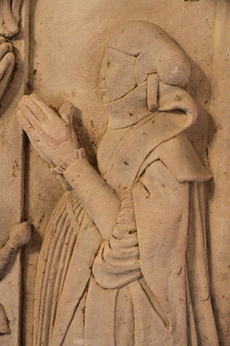 Nicht aber paßt dazu der Unterbau mit dem Hauptfeld, in dem Ehemann und Ehefrau rechts und links von einem Kruzifix dargestellt werden und hinter dem Ehemann noch ein Kind steht. Der Mann ist bärtig und barhäuptig, ansonsten vollständig gerüstet mit Dolch an der rechten und Schwert an der linken Seite, eigentümlich schräg kniend, um Raumtiefe darzustellen. Den Helm hat er an den Fuß des Kreuzes abgelegt. Genau wie er legt die Ehefrau beide Hände zum Gebet zusammen. Beide Figuren werden von einer Scheinarchitektur mit zwei Bögen eingerahmt. Jede der Hauptfiguren besitzt vier Wappen einer Ahnenprobe, je zwei oben in der Fläche des Bogenfeldes und je zwei weitere unten am Sockel. Im Detail ist die Ahnenprobe (möglicherweise rechts: Ebersberg/Schneeberg, Fuchs, Cleen/Dernbach/Nordeck zur Rabenau, Redwitz/Marschalk von Ebnet; links: Truchseß von Wetzhausen, Bibra, von der Tann, Fuchs) ungeklärt und paßt bis jetzt nicht zu dem bei Biedermann zu findenden Familiengefüge, Hinweise willkommen. Ganz sicher paßt die Wappenkombination aber nicht zu den in den obigen Inschriften genannten Personen, weil weder ein Schrimpf-Wappen für die Ehefrau noch ein solches der Voit von Salzburg für Christophs Mutter oder ein Steinau-Wappen für Kunigundes Mutter existiert, und weil Christoph weit und breit keine Verbindung zu den Truchseß von Wetzhausen hat, das hatte erst sein Sohn, und auch dort passen die Wappen nicht zu den Ahnen, denn dann müßten Schrimpf und Schott von Schottenstein auftauchen. Also muß die genaue Zuordnung der Personen vorerst offen bleiben; sicher ist nur, daß es nicht zu Biedermanns Genealogie paßt.