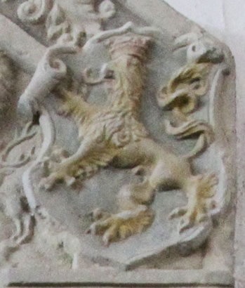 Der dritte Schild (Bild unten, links) ist geviert, und es soll folgende Zuordnung vorgeschlagen werden, Feld 1: in Gold ein schwarzer Löwe (Grafschaft Hennegau, eigentlich Flandern), Feld 2: in Schwarz ein goldener Löwe (Pfalzgrafschaft bei Rhein), Feld 3: silbern-blau schräggerautet (Wittelsbach, Herzogtum Bayern), Feld 4: in Gold ein roter Löwe (Grafschaft Holland). Das ist vermutlich eine ungewöhnliche und nirgends sonst bekannte Variante des Wappens des wittelsbachischen Teilherzogtums Niederbayern-Straubing-Holland. Der übliche Aufbau ist normalerweise etwas anders, geviert aus den Schrägrauten in den Feldern 1 und 4 und dem aus Hennegau und Holland gevierten Wappen in Feld 2 und 3, so z. B. am Hoogheemraadschap van Delfland in Delft (Niederlande) angebracht. Was wir hier sehen, ist eine phantasievolle Variante in der Kombination der Inhalte, die tatsächlich so nicht geführt wurde. Es ist lediglich eine apokryphe Form in einem Entwurf für ein nicht ausgeführtes Grabdenkmal bekannt, in der ein gevierter Hauptschild Pfalz-Bayern mit einem gevierten Herzschild Hennegau-Holland belegt wird, also alle vier Inhalte wie hier, nur doppelt und in zwei Lagen aufeinander. Vielleicht hat der Künstler sich gedacht, das kann man vereinfachen, das erkennt man so besser und ist weniger Arbeit - wir können heute nur rätseln, wie das so hierhin kommt. Es ist nicht die einzige offene Frage an diesem Epitaph.