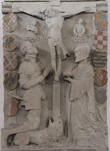 Dieses erste Epitaph in der Grünsfelder Pfarrkirche erinnert an Georg Landgraf von Leuchtenberg, den Enkel der im Rieneck-Kapitel besprochenen Dorothea von Rieneck, der zu den Nachkommen aus ihrer ersten Ehe zählt. Kurz vor ihrem Tode wurde ihrem Sohn Johann dieser Georg geboren, und diese beiden traten nach dem genialen Schachzug ihrer Mutter, um ihnen die Herrschaft Grünsfeld zu sichern, nacheinander die Herrschaft in der Stadt an.