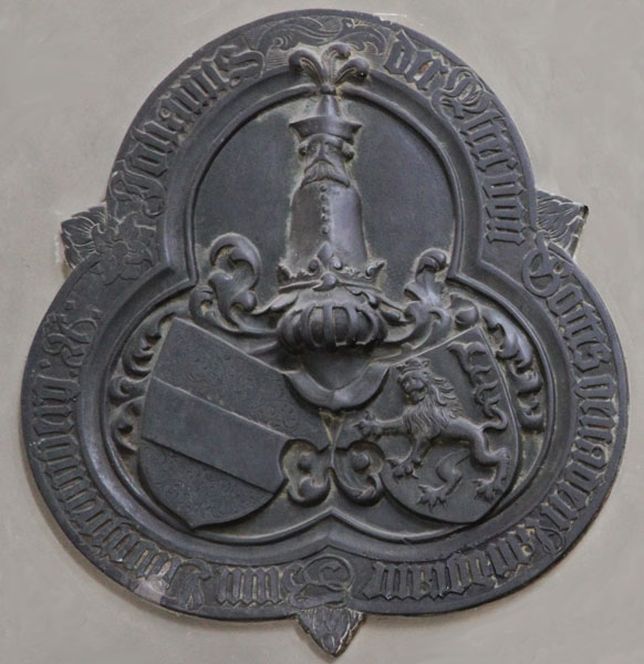 Auch zu diesem steinernen Epitaph gibt es eine passende Bronzetafel für Johannes (Johann) IV. Landgraf von Leuchtenberg (-1531): Die optisch linke Tafel des ähnlichen Paares vereint die Wappen der Landgrafen von Leuchtenberg und der Grafen von Schwarzburg, inhaltlich identisch mit denen am zuvor beschriebenen steinernen Epitaph. Die Umschrift lautet: "Johann(e)s der Elter von Gottes genaden Landgrave Zum Lewchtennberg" Im Gegensatz zu dem Allianzwappen am Steinepitaph ist hier der Löwe der Schwarzburger korrekt hersehend dargestellt.
