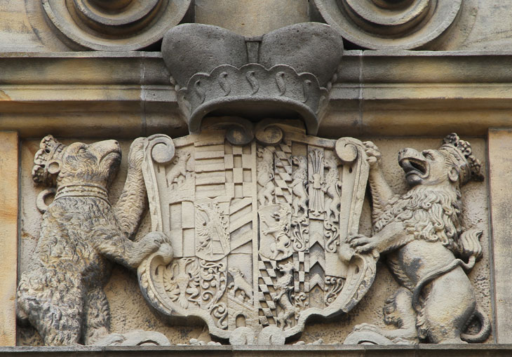 Soweit zur Bautätigkeit von Victor Amadeus. Sein Sohn Carl Friedrich Fürst zu Anhalt-Bernburg (13.7.1668-22.4.1721) räumte gleich im ersten Jahr seiner Regierung auf und stellte fertig, was unvollendet war oder zu einer repräsentativen Residenz fehlte. Er stellte den schon länger unvollendet herumstehenden Johann-Georg-Bau fertig und ließ eine neue Portalanlage am Hauptzugang erbauen, inklusive der steinernen Brücke. Beides wurde mit seinem Wappen markiert, das ebenfalls eine neue Entwicklungsstufe markiert, mit mehr Feldern und mehr Inhalten.