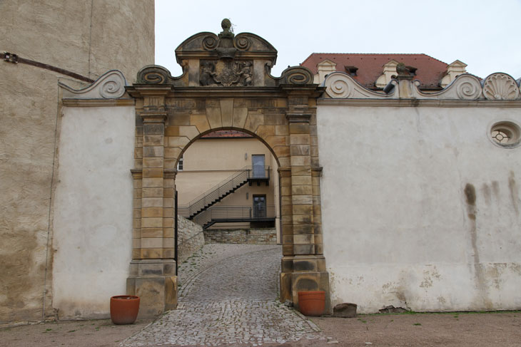 Früher fiel der Hofbereich stärker zur Saale hin ab als heute. Im Laufe der Zeit wurde der Hof aufgefüllt und nivelliert, doch auch heute noch liegt der östliche Teil der Anlage höher, nur fällt das aufgrund der Abtrennung nicht so auf. Im freien westlichen Hofteil befanden sich früher ein Ziehbrunnen und ein Bassin, das mit einer Röhrenwasserleitung versorgt wurde. Daß hier eine Mauer gezogen wurde, hatte vor allem als Grund, den herrschaftlichen Bereich von dem Wirtschaftsbetrieb zu separieren. In der Renaissance war das Nebeneinander noch akzeptabel, doch das entsprach nicht mehr barockem Repräsentationsbedürfnis. Die barocke Trennmauer im Hof, deren Härte durch Volutenornamente und Muschelornamente als Abschluß gebrochen wird, besitzt in der Mitte einen auf vier Konsolen vorkragenden Balkon ("Trompeterstuhl") und an beiden Seiten des geraden Längsstücks ein Barockportal. Das vom Hof aus gesehen linke (nördliche) Fugenrustika-Portal (Abb. oben) trägt im Gebälk die Zuordnung "V. A. F. Z. A." = Victor Amadeus Fürst zu Anhalt-Bernburg (6.10.1634-14.2.1718) und darunter die Datierung auf das Jahr 1682. An der linken Wandvorlage befindet sich ein Renovierungsvermerk "ERNEVERT 1910".