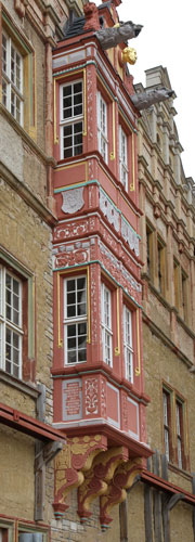 Alle anderen Flächen sind mit Rankenmotiven und floralen Arabesken verziert. Über dem zweiten Obergeschoß ragen seitlich zwei Wasserspeier nach vorne heraus. Auch dieser Erker besitzt zwei aus der Fassade vollplastisch herausschauende vergoldete Köpfe, allerdings ganz oben im Giebel, direkt nebeneinander, zwei männliche Köpfe unterschiedlicher Physiognomie, der eine jünger, mit Schnurrbart und weit geöffneten, herausfordernd blickenden Augen, der andere älter, mit Vollbart und tiefliegenden Augen. Beide wenden ihr Gesicht leicht auswärts.
