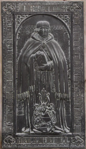Auf der Südempore des Halberstädter Domes, die im Rahmen der Besichtigung des Domschatzes zugänglich ist, befinden sich mehrere bronzene Grabdenkmäler, genauer die bronzenen Beschläge der Grabplatten von im Bereich des Domes bestatteten Mitgliedern des Domkapitels. Mehrere davon tragen Wappendarstellungen, beginnen wir hier mit einem der bedeutendsten Kleriker der Halberstädter Geschichte.