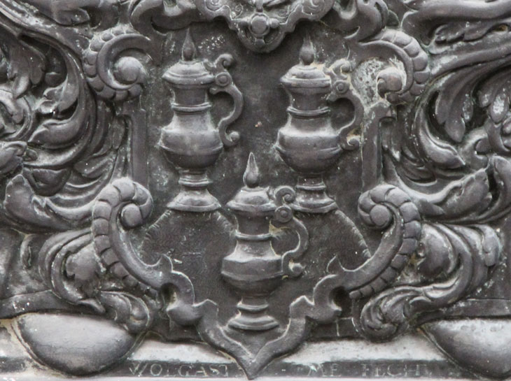 Aber dennoch müssen wir hier nicht auf die übliche Darstellung der vier Evangelisten verzichten, sie sind nur an anderer Stelle: Wir finden sie zusammen mit ihren Symboltieren paarweise im Zentralfeld in den Zwickeln rechts und links des Kleeblattbogens, gekennzeichnet durch die Gravuren unter dem Innenrand der oberen Schmalseite: "S(anctus) Matth(a)eus", "S(anctus) Marcus E(vangelista)", "S(anctus) Lucas" und "S(anctus) Johannes".