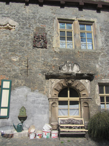 Zwischen einem vermauerten Rest eines spätgotischen Vorhangbogenfensters und einem gekoppelten Renaissance-Fenster ist hofseitig am Nordflügel ein Wappen des Magdeburger (1513-1545) und Mainzer (1514-1545) Erzbischofs und Halberstädter (1513-1545) Bischofs Albrecht von Brandenburg (28.6.1490-24.9.1545), Kurfürst des Heiligen Römischen Reichs, in das Bruchsteinmauerwerk eingelassen. Die gegenwärtige Farbgebung hat nichts mit korrekten Tinkturen zu tun. Deshalb werden nachfolgend einzig die korrekten Soll-Tinkturen angegeben, in denen hoffentlich irgendwann einmal nach Abschluß der Renovierungsarbeiten dieses Wappen wieder erstrahlen wird: Hauptschild: geviert, Feld 1: in Silber ein roter Adler, auf den Saxen belegt mit goldenen Kleestengeln, golden bewehrt, Markgrafschaft Brandenburg, Feld 2: in Silber ein roter, golden bewehrter Greif, Herzogtum Pommern, Feld 3: innerhalb eines silbern-rot gestückten Bordes in Gold ein schwarzer doppelschwänziger Löwe, rot gekrönt, Burggrafschaft Nürnberg, Feld 4: silbern-schwarz geviert, Stammwappen Hohenzollern, drei (2:1) gestellte Herzschildchen, Herzschild 1 (oben rechts): in Rot ein silbernes, sechsspeichiges Rad, Erzstift Mainz, Herzschild 2 (oben links): rot-silbern geteilt, Erzstift Magdeburg, Herzschild 3 (unten): silbern-rot gespalten, Hochstift Halberstadt. Die Reihenfolge der drei geistlichen Fürstentümer entspricht der üblichen, die Erzstifte vor dem geringeren Stift, das Erzstift Mainz wegen der Kurwürde und dem Amt des Erzkanzlers des Heiligen Römischen Reiches an erster Stelle vor Magdeburg. Mit dieser Auswahl an Inhalten ist es ein kleineres Wappen, wie es auch im Neuen Kapitelsaal in Halberstadt angebracht ist; eine größere Variante kann man in Mainz an dem von ihm gestifteten Brunnen sehen, und eine noch größere mit noch mehr Feldern in Aschaffenburg in der Stiftskirche an seiner Gedächtnisanlage.