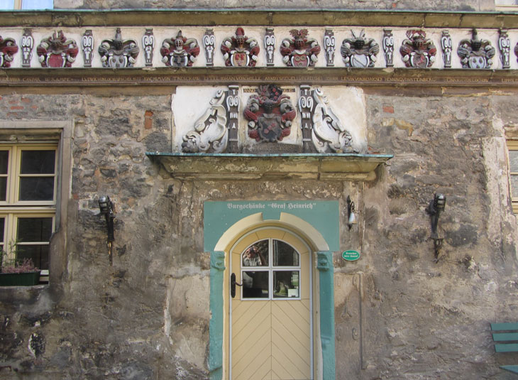 Der heraldische Höhepunkt ist jedoch die knapp ein Jahrhundert jüngere Repräsentation des ganzen Halberstädter Domkapitels mit den Wappen der Mitglieder. Die Wappenreihe befindet sich der Tordurchfahrt gegenüber hofseitig am Westflügel. Hier lag früher der Hauptzugang in die Räume der Burg. Später wurde der mit einem Halbkreis geschlossene Zugang vermauert und der neue Zugang in den Nordflügel verlegt, gleich im Eck rechts neben der Tordurchfahrt, mit schöner geschnitzter Holztür. Noch später wurde der alte Zugang in den Westflügel wieder geöffnet. Insgesamt sehen wir zwischen zwei Gesimsen eine Wappenreihe von insgesamt 14 Einzelwappen, beginnend links mit den Dignitäten, dem Domdekan (Leitung des Kapitels nach innen), zugleich Portanarius, und dem Senior, zugleich Cellerarius, dann dem Subsenior und den anderen Domherren, und darunter noch ein separates Wappen direkt über der Tür für den bischöflichen Hauptmann, alles auf das Jahr 1616 datiert. Solche Wappenreihen mit etlichen Repräsentanten des Halberstädter Domkapitels sind auch andernorts zu finden, zwei an der Halberstädter Dompropstei, eine im Stadtmuseum, eine in der Neuenstädter Kapelle, zwei an Burg Schneidlingen und sogar vier an Burg Zilly. Eine dieser Wappenreihen an Burg Zilly ist zeitlich sehr nahe an dieser in Schlanstedt; sie beginnt mit dem gleichen Domdekan und besitzt auch sonst etliche Überschneidungen, ebenso in Schneidlingen. Auch hier soll angemerkt werden, daß die Farbfassungen durchgehend nicht korrekt sind, und der Hoffnung Ausdruck verliehen werden, daß man das bei der anstehenden Renovierung in den heraldisch zutreffenden und notwendigen Tinkturen anstreicht.