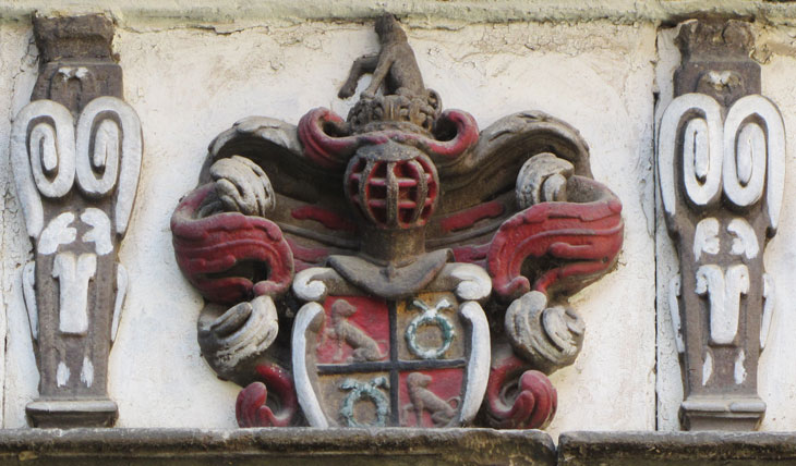 Seitlich sieht man die gedrehten Schnüre schräg nach unten weggehen, aber es werden keine Fiocchi dargestellt. Dennoch kann der Galero als Zeichen gewertet werden, daß die Kardinalswürde bereits verliehen war, so daß sich eine Datierung nach 1521 ergibt. Über dem Wappen ist eine kleine Tafel mit der gotisch geschriebenen Jahreszahl 1524 angebracht, so daß das auch im Kontext paßt.