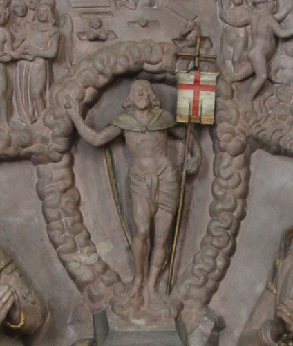 Das große Zentralfeld, das 1,40 m hoch und 1 m breit ist, wird oben bogenförmig abgeschlossen. In der Mitte des Feldes steht auf einem hohen viereckigen Sockel, vermutlich das Heilige Grab symbolisierend, in einer ovalen Wolkenmandorla der auferstandene Christus mit einer Kreuzes-Siegesfahne in der Linken, rotes Kreuz auf weißem Tuch. Über ihm findet das Jüngste Gericht bei seiner Wiederkunft statt. Seine rechte Hand weist nach oben auf die nächste Gruppe des Reliefs. Rechts und links der Auferstandenen sind der verstorbene Ritter und seine Frau dargestellt, beide mit eingeknickten Beinen und in leichter Rücklage, beide mit vor der Brust zum Gebet zusammengelegten Händen, er in Rüstung, aber mit abgelegtem Visierhelm und darunter deponierten Handschuhen, sie mit Rosenkranz. Zu seinen Füßen kauert ein Löwe, zu ihren Füßen ein Schaf oder Lamm. Beim Ritter kommt die Bogenform durch die Körperhaltung zustande, bei seiner Frau durch die bogenförmigen Gewandfalten. Durch diese Haltung öffnet sich der Raum zwischen den beiden Figuren für die Auferstehung Christi dazwischen, die zum Jüngsten Gericht darüber überleitet.