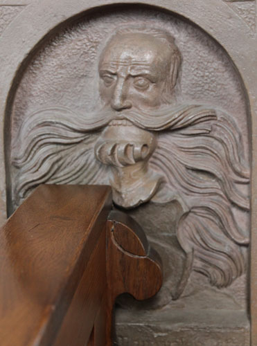 In der Mitte symbolisiert die glatte Fläche mit den rechteckigen Löchern ein Gräberfeld, aus dem sich die Toten erheben. Links stehen die Seligen oder Benedicti, dicht an dicht, mit wenig Pose, brav und langweilig eben. Die Verdammten oder Maledicti werden rechts mit weit mehr Drama in der Darstellung dem Höllenschlund zugetrieben, der hier die Form eines riesigen, alles verschlingenden Rachens annimmt. Unter den Figuren ist durch die mit mehr Aufmerksamkeit erfolgte Herausarbeitung eine Figur besonders hervorgehoben: Ein fetter nackter Mann, durch die Tonsur als Mönch erkennbar, nimmt eine dem Betrachter frontal zugewandte Frau links von ihm in den Arm und nötigt sie, mit ihm in die ewigen Höllenqualen zu stürzen. In diese Darstellung kann ein subtiler Angriff der katholischen Auftraggeber auf die evangelische Konfession und damit mittelbar auf das evangelische Herzogtum Württemberg hineingesehen werden, weil durch die Reformation die Heirat von einstigen Mönchen möglich wurde.