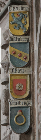 Bleibt noch das Wappen ganz oben (Abb. oben rechts), das Holzem als "Litzelburg" und Nägele als "Lützenburg" lesen. Tatsächlich steht dort "Litzelburg", und gemeint ist die ursprünglich lothringische und im Elsaß vorkommende Familie der von Lützelburg, in Gold ein eigentlich gekrönter blauer, rotgezungter Löwe. Die zugehörige Helmzier wäre zu blau-goldenen Decken ein wachsender goldengekrönter blauer Löwe. Die Familienmitglieder, deren Stammburg bei Lutzelbourg im Département Moselle liegt, waren ursprünglich Dienstmannen der 1149 ausgestorbenen Grafen von Lützelburg, mit denen sie nicht verwechselt werden dürfen.