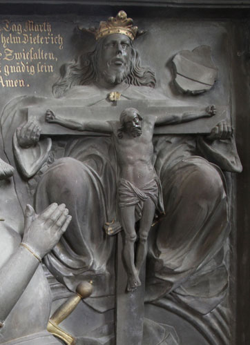 Es handelt sich bei dem Verstorbenen um Wilhelm Dietrich Speth (23.6.1546-2.3.1615) von und zu Zwiefalten, den Sohn von Ulrich Speth (-1549) und Ursula von Uttenheim zu Ramstein (-8.9.1586). Wilhelm Dietrich Speth hat sich vermählt mit Susanne von Neuneck (-1603), Tochter von Johann Georg von Neuneck und Johanna von Bubenhofen. Sie starb vor ihm, und es muß für sie eine unglückliche und leidvolle Ehe gewesen sein, die Eheleute hatten sich gründlich entzweit. In dieser Epitaphiensammlung befindet sich auch eine Grabplatte für eine ledig und jung verstorbene Tochter von Wilhelm Dietrich (siehe erstes Kapitel).