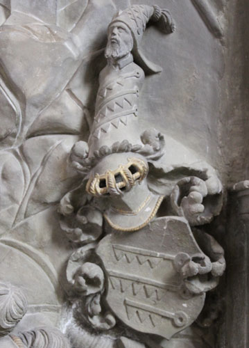 Die beiden Pilaster sind auf der Vorderseite ausschließlich mit bossenartigen Ornamenten wie facettierten Würfeln, Rauten, Rechtecken, Walzen und Kugeln belegt; die Ahnenprobe des Ehepaares ist an die inneren, leicht schrägen Schmalseiten der Pilaster gerückt worden. In den beiden oberen Zwickeln zwischen Bogen und Rahmen sind die Evangelistensymbole von Matthäus (Engel) und Markus (geflügelter Löwe) angebracht, beide durch ein Schriftband identifiziert.