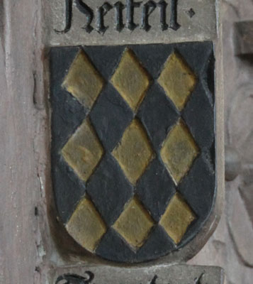 Dann folgt ein ungeklärtes Wappen (Abb. oben links), beschriftet "Heifeil" oder "Neifeil", Holzem liest "Beifeil", Nägele liest "Neiteil (= Neuneck?)". Neuneck kann mit Sicherheit als Verzweiflungsinterpretation angesehen werden, weil die ein ganz anderes Wappen führten. Hier hat eine schlechte Restaurierung ganze Arbeit geleistet. Einen schwarz-golden gerauteten Schild führten beispielsweise die Haust von Ulmen und weitere Familien, aber die sind es ganz bestimmt nicht mangels regionalem Bezug. In den bereits oben erwähnten Druckfahnen des nicht mehr zur Veröffentlichung gelangten dritten Teils der Familiengeschichte der Speth von Arthur von Speth-Schülzburg wird die Schrift als "Niuweil" gelesen (ein herzliches Dankeschön an Herrn Volker Trugenberger für diese Information). Aber auch das hilft nicht wirklich weiter, weil kein solches Wappen mit den Namen Niuweil, Neuweil, Neuwyl, Neiweil, Neiwyl o. ä. aufgefunden werden konnte. Auch dieses Wappen muß daher offen bleiben, Hinweise willkommen.