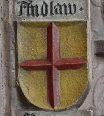 Als nächstes beim Gang von unten nach oben folgt das ebenfalls von allen gleich gelesene "Andlaw" (Abb. oben links), die unterelsässische Familie der Herren von Andlau, in Gold ein durchgehendes rotes Kreuz. Die zugehörige Helmzier wäre zu rot-goldenen Decken ein wachsender bärtiger Königsrumpf (Mannesrumpf) in rotem Gewand mit Hermelinkragen, golden gekrönt. Die von Andlau hatten ihren Stammsitz in der Thalburg in der Stadt Andlau nahe Barr im Département Bas-Rhin im Unterelsaß und erbauten in der Mitte des 13. Jh. die Burg Hoh-Andlau auf einem Berg über der Stadt, die ihnen bis zur französischen Revolution gehörte. Die Familie spaltete sich in mehrere Linien auf, von denen die in Deutschland und in der Schweiz 1917 und 1961 erloschen, die in Frankreich aber nach wie vor bestehen.