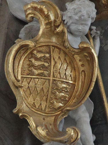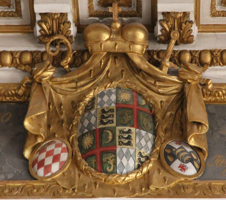 großes, leicht schräg in den Raum gestelltes Klosterwappen des Stifts