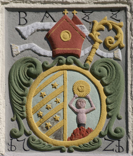 Hier ist das Gesamtwappen gespalten, heraldisch rechts das Wappen der Grafen von Achalm, links das persönliche Wappen des Abtes. Auf der Kartusche ruht eine Mitra mit nach rechts und links ausgestreckten Infuln, schräglinks ragt hinter der Kartusche der goldene Krummstab hervor mit nach rechts abflatterndem, zwischen den beiden Spitzen der Mitra hindurchgezogenen Sudarium. Die Initialen "B A Z Z" verweisen auf "Beda Abt Zu Zwiefalten".