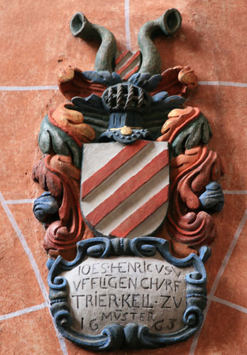 Die besten Wappendarstellungen sind an der Empore von St. Georg angebracht. Das linke Wappen ist inschriftlich bezeichnet mit "IO(HANN)ES HENRICVS V(ON) / VFFLI(N)GEN CHVRF(VERSTLICH) / TRIER(ISCHER) KELL(NER) ZV / MV(EN)STER / 1663". Johannes Heinrich von Ufflingen (1619-12.4.1680) war Kellner (Amtmann) von Münstermaifeld. Das hier gewendete Wappen zeigt in Silber drei rote Schrägbalken, auf dem Helm mit rot-silbernen Decken der Schild verkleinert zwischen einem Paar Büffelhörner. Nachweise: Anders bei Gruber, dort auf dem Helm mit rot-silbernen Decken der Schild (in Silber drei rote Schrägbalken) zwischen einem rechts roten und links silbernen Flug, danach Zobel Tafel 341. Die Familie der von Ufflingen hatte eine enge Beziehung zum Niederwerther Kloster; es gab mehrere Konventsmitglieder und sogar zwei Äbtissinnen, Maria von Ufflingen (-22.1.1669), gewählt am 21.3.1658, und Anna Renata von Ufflingen (-25.8.1703), gewählt 1669, und eine Priorin, Maria Katharina von Ufflingen, 1722 erwähnt. Wie wir unten sehen werden, tauchen dieser Familienname und dieses Wappen auch auf den Grabsteinen auf. Die Familie der von Ufflingen finanzierte die 1663 eingebaute größere Nonnenempore in der Kirche, denn die Augustiner brauchten damals einen großen Chor, die Nonnen brauchten aber jetzt eine große Empore, und am 12.9.1672 spendete Johannes Heinrich von Ufflingen erneut für die Erweiterung der Konventsstube. Das zweite Wappen an der Empore heraldisch links ist das der Ehefrau des Stifters, Barbara Philippi. Die Inschrift in der Kartusche unter dem Wappen lautet: "BARBRA PHILIPY / SEIN EH(E)LICHE / HAVS FR(A)W / 1663". Ihr Wappen zeigt nach Befund in Rot zwei schräggekreuzte silberne Doppelhaken, auf dem Helm mit rot-silbernen Decken ein roter Flug, jeder Flügel mit einem aufrechten silbernen Doppelhaken belegt. Das Wappen ist nicht im Siebmacher, weder im Gruber noch im Zobel enthalten. Sie und ihr Ehemann sind beide in Niederwerth begraben worden.