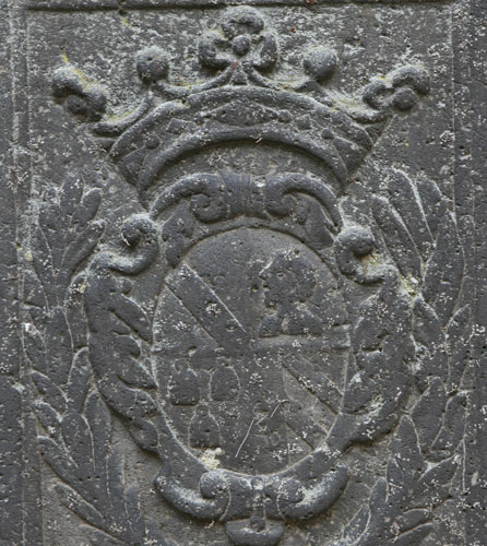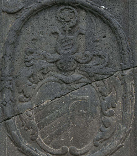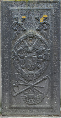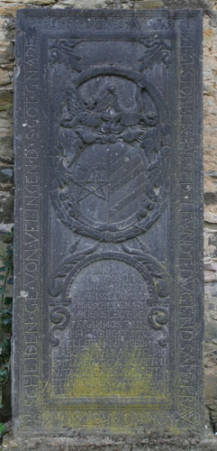 Diese Platte unterscheidet sich von den bisher vorgestellten dadurch, daß sie nur eine einzige Inschrift enthält, dafür aber neben dem zentralen Wappenpaar noch vier Wappen einer Ahnenprobe. Die außen auf dem Rand umlaufende Inschrift lautet: "A(NN)O 1680 DEN 12 APRIL(IS) / OBYT TV (?) PR(A)ENOB(IL)IS AC CLARIS(SIMVS) D(OMI)NVS IO(HAN)NES HENRIC/VS AB VFFLINGEN / NATVS A(NN)O 1619 AETATIS SVAE 61 R(EQVIESCAT) I(N) P(ACE) A(MEN)" - dies ist der Grabstein, der zu den beiden Wappen an der Empore paßt, denn er ist für Johannes Heinrich von Ufflingen (1619-12.4.1680), vermählt mit Barbara Philippi. In der Mitte sehen wir eine gespaltene Ovalkartusche mit den beiden Schildinhalten und den beiden Oberwappen wie an der Empore in der Kirche (siehe oben).