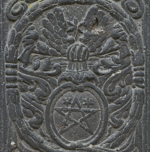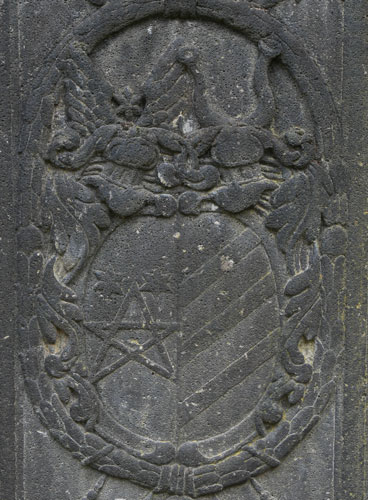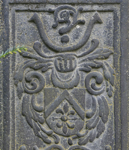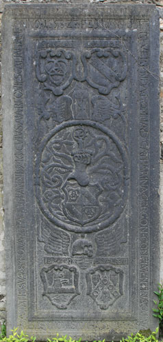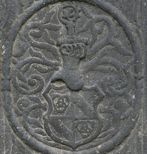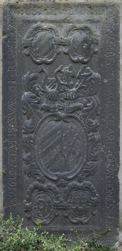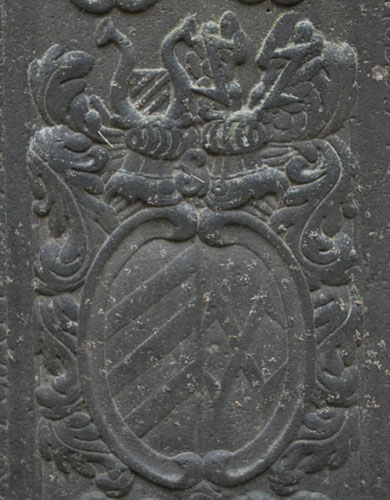 "A(NN)O 1688 DIE 6 FEBRVARY / OBYT PRAENOBILIS ET GENEROSA DOMINA GERTRVDIS CLAVDIA / NATA DE LENZER PERILLVSTRIS / AC GENEROSI D(OMINI) DE REITZENSTEIN RELICTA VIDVA R(EQVIESCAT) I(N) P(ACE) AMEN". Gertrud Claudia von Lenzer (-6.2.1688) war die hinterbliebene Witwe eines Herrn von Reitzenstein. Zwei schräggekreuzte Palmzweige rahmen seitlich die ovale Kartusche, die oben von einer Laubkrone bedeckt wird. Das Wappen ist geviert, Feld 1: ein Schrägrechtsbalken, Feld 2: eine Männerbüste oder Mohrenbüste (Brustbild), Feld 3: drei (2:1) Objekte mit Ring am oberen Ende (Glocken? Gewichte?), Feld 4: neben einer rechten Flanke zwei Schrägrechtsbalken. Feld 1 würde zu dem Ehemann aus der Familie von Reitzenstein passen, die führten in Rot einen silbernen Schrägbalken. Dann könnte vorbehaltlich einer Verifizierung durch genealogische Daten (Hinweise willkommen) das Wappen insgesamt möglicherweise eine 2x 2er Ahnenprobe darstellen, Feld 2: Wappen Lenzer, Feld 3: Mutter des Ehemannes, Feld 4: Mutter der Ehefrau. Im unteren Bereich des Zentralfeldes befindet sich eine Leerfläche, wenn hier je eine Inschrift vorgesehen war, wurde sie nicht ausgeführt.