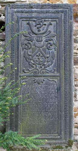 Die Inschrift dieser nächsten hier vorgestellten Grabplatte lautet: "ANNO 1658 22 FEBRVARY OBYT / REVERENDA DOM(I)NA D(OMINA) CATHARINA GERGON CONFLVENTINA QVARTA / ABBATISSA HVIVS MONASTERY / AETATIS SVAE 84 QVA PRAEFVIT ANNIS 46 CVIVS A(N)I(M)A REQVIESCAT IN PACE". Die aus Koblenz stammende Katharina Gergon (-22.2.1658) war die vierte Äbtissin auf Niederwerth und starb im Alter von 84 Jahren, nachdem sie 46 Jahre lang den Kloster vorstand.