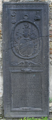 An zwei weitere Äbtissinnen, die Schwestern waren, wird mit diesem Grabstein gedacht. Die Inschrift im unteren Bereich des Zentralfeldes lautet: "SORORI PIAE / TANDEM / ACCESSIT / ADM(I)R(AN)DA & PRAENOB(ILIS) / DOMINA ANNA RENATA / AB VFFLINGEN A(NN)O 1703 / 25 AVG(VSTI) AETATIS SVAE 68 / PROFF(E)SSIONIS 48 & / ABBATIALIS REGIMINIS 34 / REQVIESCAT IN PACE". Äbtissin Anna Renata von Ufflingen (-25.8.1703) starb im Alter von 68 Jahren, im 48. Jahr ihrer Profeß und im 34. Jahr ihres Amtes. Die ersten beiden Zeilen enthalten ein Chronogramm und ergeben SORORI PIAE / TANDEM / ACCESSIT = I + I + D + M + C + C + I = 1 + 1 + 500 + 1000 + 100 + 100 + 1 = 1703. Die äußere Umschrift lautet: "VLTIMA EI VITAE PER ACTA PERIODVS / HOC ANNO OBIEBAT REVERENDA ET V(ENERABILIS) ABBATISSA MARIA AB VFFLINGEN / IN FESTO SANCTI VIN/CENTII MARTYRIS AETATIS SVAE CVIVS ANIMA REQVIESCAT IN PACE". Auch in Abschnitt entlang der oberen Schmalseite steckt ein Chronogramm: VLTIMA EI VITAE PER ACTA PERIODVS = V + L + I + M + I + V + I + C + I + D + V = 5 + 50 + 1 + 1000 + 1 + 5 + 1 + 100 + 1 + 500 + 5 = 1669. Entlang der Längsseite ergibt sich ebenfalls die gleiche Jahreszahl, HOC ANNO OBIEBAT REVERENDA ET V ABBATISSA MARIA AB VFFLINGEN = C + I + V + D + V + I + M + I + V + L + I = 100 + 1 + 5 + 500 + 5 + 1 + 1000 + 1 + 5 + 50 + 1 = 1669. Der Gedenktag des hl. Vinzenz von Saragossa = Vinzenz von Valencia ist der 22. Januar. Ein drittes Mal ist die Jahreszahl 1669 oberhalb der Inschriftenzone im Zentralfeld zu lesen, in arabischen Zahlen. Maria von Ufflingen (-22.1.1669) wurde am 21.3.1658 zur Äbtissin gewählt und war die unmittelbare Amtsvorgängerin ihrer Schwester Anna Renata von Ufflingen (-25.8.1703). Das Wappen ist gespalten, in der rechten Spalthälfte erkennt man das Wappen der Herren von Ufflingen wie beschrieben, und auch die Helmzier stammt von dieser Familie. Dahinter ragt der Krummstab als Amtszeichen der beiden Äbtissinnen auf. Weil das Wappen der zweiten Spalthälfte unten an einer anderen Grabplatte auftaucht, kann aus dem Zusammenhang geschlossen werden, daß beide Äbtissinnen Schwestern des oben erwähnten Johannes Heinrich von Ufflingen waren, der so viel für das Kloster gespendet hat und an der Emporenerweiterung mit seinem Wappen verewigt ist.