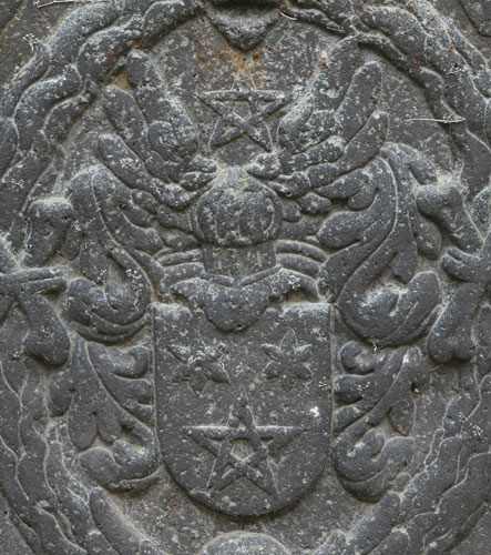 In den vier Ecken des Zentralfeldes sind insgesamt vier beschriftete Ahnenwappen angebracht, heraldisch oben rechts "GERGON" (drei (2:1) miteinander verschränkte Ringe), oben links "GVTMAN" (mit drei Rosen belegter Schrägbalken), unten rechts "BRACK" (hinter einem Balken hervorwachsende Bracke mit Halsband) und unten links "LANGENBEIT" (ein mit fünf (1:2:2) Ringen belegter Sparren zwischen drei (2:1) bärtigen Männerköpfen).