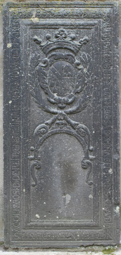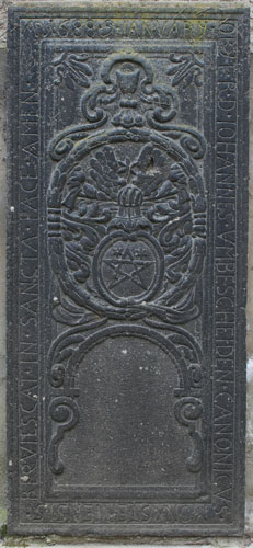 Genau das gleiche Wappen taucht auch an dieser Platte auf, nur wieder in der Variante mit dem Stern zwischen dem Flug als Kleinod. Das Wappen der Umbscheiden wird von einem ovalen Lorbeerkranz eingefaßt, auf dem oben ein Meßkelch als Hinweis auf die geistliche Karriere steht. In die beiden oberen Zwickel ragt jeweils schräg nach unten aus der Ecke hervorkommend ein Lilienornament. Die umlaufende Inschrift lautet: "A(NN)O 1688 9. IANUARY / OBYT R(EVERENDUS) D(OMINUS) IOHANNES VMBESCHEIDEN CANONICVS / MONASTERIENSIS / REQVIESCAT IN SANCTA PACE AMEN". Auch Johannes Philipp Umbscheiden war klösterlicher Kanoniker. Im unteren Teil des Zentralfeldes wäre noch Platz für eine zweite Inschrift gewesen, die aber nicht ausgeführt wurde. Er war freilich nicht in Niederwerth Kanoniker, sondern am Kollegiatstift St. Martin und Severus in Münstermaifeld, wo er 1671-1688 als solcher genannt wird. Er hatte zunächst 1671-1676 seine Exspektanzjahre. Ab 1677 war er Kapitular. Am 5.6.1677 erhielt er die niederen Weihen für das Subdiakonat und Diakonat; am 24.1.1683 erhielt er die Priesterweihe. Er war 1679-1680 Prokurator und 1683-1687 Kapitelssekretär. In Münstermaifeld gehörte ihm ein Haus, die sogenannte Hungerburg. Der Tod ereilte ihn in Ehrenbreitstein, als er auf Verwandtenbesuch war; deshalb wurde er in Niederwerth begraben.