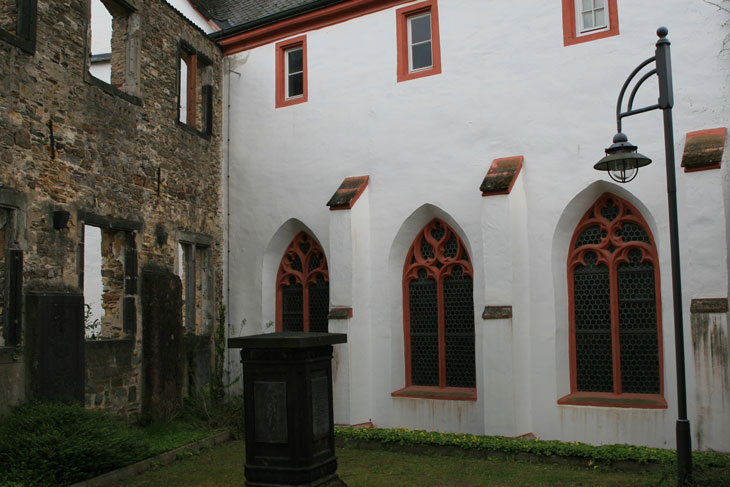 Dann beginn die dritte Phase, die eine erneute Rochade mit sich brachte: Der Trierer Fürstbischof Jakob von Eltz brauchte Platz in der Koblenzer Innenstadt, weil er 1580 im Rahmen der Gegenreformation die Jesuiten ansiedeln wollte. Dafür wurden die Zisterzienserinnen in der Leer (ein dem Zisterzienserkloster Himmerod unterstelltes Marienkloster, an der Stelle des späteren Jesuitenkollegs, heute Koblenzer Rathaus) nach 338 Jahren Existenz aus ihrer Bliebe ausquartiert und nach Niederwerth umgesiedelt, sehr zu deren Verdruß. Dabei entsprach die abgeschiedene Lage auf der Insel eigentlich guter zisterziensischer Tradition, denn die Klostergründung in abgelegenen Tälern war typisch für die Zisterzienser. Doch hier handelte es sich nicht um eine Gründung, sondern um eine Zwangsumsiedlung. Außerdem war es eine Zumutung, den Komfort einer Innenstadtlage gegen eine einsame Insel einzutauschen, wo Wind und Wetter, Rhein-Hochwasser, Räuber, Eisgang im Winter und marodierende Soldaten mit den Nonnen machen konnten, was sie wollten. Der Protest, der auch vor einer fürstbischöflichen Kommission mit viel Drama seitens der Äbtissin Gutta Bolen von Mertloch vorgetragen wurde, verhallte ungehört, dem Kurfürsten war es wichtiger, mit Hilfe der Jesuiten dafür zu sorgen, daß Koblenz katholisch blieb. Er holte sich Rückendeckung vom Papst, der beiden Maßnahmen, der Umsiedlung und der Ansiedlung, urkundlich mit einem Breve am 4.5.1580 zugestimmt hatte, und drohte den widerspenstigen Nonnen am 2.9.1580 schließlich mit Exkommunikation - und schwups konnten sie per Schiff auf die Insel verfrachtet werden, 7 Nonnen, 4 Laienschwestern und 2 Novizinnen. Aber ohne Äbtissin Gutta Bolen von Mertloch, denn die war noch vor der Übersiedlung am 22.9.1580 verstorben, vor Altersschwäche, Gram und Aufregung. Am 26.9.1580, dem Tag der Umsiedlung, wurde Anna I. Meser von Horchheim zur nächsten Äbtissin gewählt; für sie existiert ein Grabstein in der Sammlung.