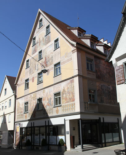 Im 18. Jh. wohnte in dem Haus die Bildhauerfamilie Kazenmayer. Nach der Säkularisierung wurde das Haus 1805 an Privateigentümer verkauft. Der Südgiebel stürzte 1872 ein und wurde erneuert, daher fehlt dort die Treppenform des Giebels. Die illusionistische Fassadenmalerei mit Szenen aus der Geschichte der Stadt und des Reiches erhielt das Haus im Jahre 1910-1911. Im einzelnen zeigen die Szenen im ersten Obergeschoß auf der Längsseite 1.) links die Gründung des Deutschen Reiches 1871 mit den Protagonisten Kaiser Wilhelm I., Bismarck als Reichskanzler, Moltke als Generalfeldmarschall, dem späteren Kaiser Friedrich III., mit Reichsadler, Germania und der Burg Hohenzollern bei Hechingen im Hintergrund, 2.) in der Mitte Kaiser Wilhelm II. in Berlin, vor dem Reichstagsgebäude und in die Parade-Uniform der Gardes du Corps gekleidet, und 3.) rechts die Initialen der Hausbesitzer, Oskar Bartholomä und seine Frau Anna, dazu die Signatur des Malers Karl Mullinger 1911. Die Szenen im zweiten Obergeschoß der Längsseite zeigen 1.) links und in der Mitte die Erstürmung des Bussen 1633 im Dreißigjährigen Krieg und die Zerstörung durch die schwedischen und württembergischen Truppen sowie 2.) rechts die Einverleibung der Stadt Riedlingen in das neu geschaffene Königreich Württemberg im Jahre 1806. Weitere Szenen befinden sich auf der Giebelseite (Abb. ganz unten).