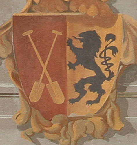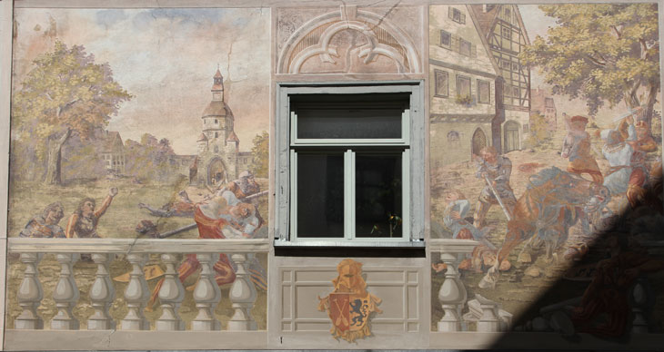 Ebenfalls finden wir an der straßenseitigen Giebelfassade das Riedlinger Stadtwappen, nach Befund gespalten, rechts in Rot zwei schräggekreuzte Ruder, links in Gold ein schwarzer Löwe. Heute wird das Wappen anders geführt, gespalten, rechts in Rot ein silberner Balken, überdeckt von zwei schräggekreuzten goldenen Rudern, links in Gold ein roter Löwe. Der Löwe ist das Stammwappen der Habsburger, das Wappen des Erzherzogtums Österreich bildet seit dem 16. Jh. den Hintergrund für die Ruder, ein redendes Element, denn ein alter Name der Stadt war Rudelingen. Riedlingen gehörte 1291-1805 zu Österreich. Diese Malerei weicht hinsichtlich des fehlenden erzherzoglichen Balkens und der Farbe des Löwen vom heutigen Stadtwappen ab.