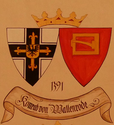 Abb. oben rechts: 1391-1393 Konrad von Wallenrode (-23.7.1393, aus einer fränkischen Familie, 1365-74 Pfleger von Preußisch Eylau, 1376 Hauskomtur von Christburg, 1377-1382 Komtur von Schlochau = Czluchów in der polnischen Woiwodschaft Pommern, 1382-87 Oberster Marschall, 1387 Komtur von Marienburg und Großkomtur, am 20.8.1390 Statthalter für das Hochmeistertum, am 20.8.1391 Wahl zum Hochmeister, mehrere Feldzüge gegen Litauen, gestorben in der Marienburg). Wappen aus zwei separaten Schilden, rechts das Hochmeisterkreuz, links in Rot eine silberne (nicht wie hier goldene!), viereckige Gürtelschnalle (Rinck) mit durchgestecktem Dorn (von Wallenrode). In der von Hans-Georg Boehm publizierten historischen Handschrift wird das Wappen in gevierter Form wiedergegeben, was zu dieser frühen Zeit unwahrscheinlich ist, Feld 1 und 4: Hochmeisterkreuz, Feld 2 und 3: von Wallenrode. Im Berliner Wappenbuch Einzelschild. In der von Hans-Georg Boehm publizierten historischen Handschrift liegt die Gürtelschnalle horizontal, im Berliner Wappenbuch steht sie auf einer Spitze und ist an den Ecken kleeblattverziert, was auch der Darstellung des Familienwappens im Berliner Wappenbuch und im Scheiblerschen Wappenbuch entspricht und als korrekt anzusehen ist, ebenso wie die silberne Tinktur der Gürtelschnalle unzweifelhaft korrekt ist.