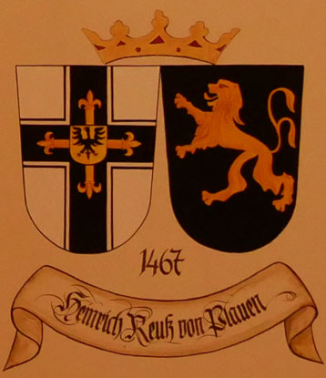 Abb. oben rechts: 1467-1470 Heinrich Reuß von Plauen (1400-2.1.1470, diesmal wirklich aus der Linie der Reuß von Plauen, Neffe von Ludwig von Ellrichshausen, Komtur von Balga 1433, danach von Elbing, 1440 wieder von Balga, oberster Spittler und Komtur von Elbing 1441, führte ein Ordensheer im Dreizehnjährigen Krieg gegen Polen, Reise nach Jerusalem, seit 1461 Ritter vom Heiligen Grab, Komtur von Preußisch Holland = Paslek in Polen 1466, 1467 Statthalter des Hochmeistertums, 15.10.1469 Wahl zum Hochmeister, am 29.11.1469 Huldigungseid zu Peterkau, gestorben in Mohrungen, beigesetzt im Königsberger Dom). Wappen aus zwei separaten Schilden, rechts das Hochmeisterkreuz, links in Schwarz ein goldener Löwe (Reuß von Plauen). In der von Hans-Georg Boehm publizierten historischen Handschrift wird das Wappen alternativ in gevierter Form wiedergegeben, Feld 1 und 4: Hochmeisterkreuz, Feld 2 und 3: Reuß von Plauen.