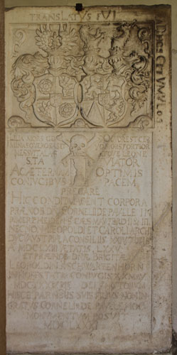 Die Inschrift dieses Grabsteines lautet: "LILIA MORS GE/MINASQVE ROSAS ET / MESSVIT ALAS // OCYOR EST CER/VO MORS FORTIOR / ATQVE LEONE // STA VIATOR / AC AETERNAM OPTIMIS / CONIVGIBVS PACEM / PRECARE / HIC CONDITA IACENT CORPORA / PRAENOB(ILIS) D(OMI)NI CORNELII DE PAVLLE IN / RIMERZHEIDEN S(VORVM) CAES(AREORVM) MAY(ESTATVM) FERD(INANDI) II. & III. / NEC NON LEOPOLDI ET CAROLI ARCHI/DVCV(M) AVSTRIAE A CONSILIIS XXIV 7BRIS / A(NN)O MDCLXIII AETATIS LXXV / ET PRAENOB(ILIS) D(OMI)NAE BRIGIT(T)AE / LEOPOLDIN A SCHWARZENHORN / IN HOFFSTAT &c CONIVGIS XX MAY / MDCXXXIX PIE DEFVNCTORVM / HISCE PAR(E)N(TI)BUS SVIS FILIVS NON IN / GRATVS CORNELI(VS) DE PAULLE HOC / MONVMENTVM POSVIT / MDCLXXXI".