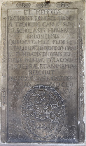 Den größten Teil des Grabmonumentes nimmt die Inschrift ein, mit den ersten drei Buchstaben auf dem oberen Rand beginnend: "D(EO) O(PTIMO) M(AXIMO) / ET MEMORIAE / D(OMINI) CHRIST(OPHORI) ERNESTI TROILI / A TROIBURG CAN(ONICI) ET SUM/MI SCHOLASTI(CI) HUIUS EC(C)L(ESI)AE / BRIXINENSIS / QUI OCTO MIL(L)I(BUS) FLOR(ENORUM) HOS/PITALI SUPERIO(RI) DONO DATIS / ET FUNDATIS DUOBUS BENE/FICUS IN HAC EC(C)L(ESI)A CORPVS / HUIC TERRAE ET ANIMAM DEO / REDDIDIT / DIE XIX MENSIS OCTOBRIS / ANNO MDCLIIII / VIXIT LXVI ANNOS". Dieser Stein ist also dem größten und besten Gott geweiht und dem Angedenken an den Brixener Kanoniker und Scholaster Christoph Ernst Troilo von Troiburg (-29.10.1654), der 8000 fl. für das obere Hospital stiftete, dessen Körper hier beerdigt ist und dessen Seele er an Gott zurückgab, und welcher 66 Jahre alt wurde.