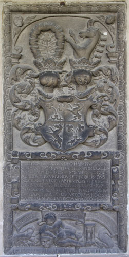 Dieses Epitaph für den Brixener Kanoniker Nikolaus Fueger von Hirschberg (-6.5.1602) trägt in einer rechteckigen Kartusche in der unteren Mitte innerhalb eines Schmuckrahmens folgende Inschrift: "AEDIFICATIONEM EX DEO HABEMVS DOMVM / NON MANV FACTAM SED AETERNAM IN COELIS / ANNO D(OMI)NI M.D.CII. DIE. VI. MENSIS MAII. OBIIT / ADMODVM REVERENDVS ET NOBILIS D(OMI)N(V)S / NICOLAVS FVEGER AB HIRS(CH)PERG TRIDENT(INAE). ET / BRIXINENSIS CATHEDRALIVM ECCLESIARVM / CANONICVS SENIOR ET PRAEPOSITVS AD BE/ATA(M) VIRG(INEM) IN AMBITV CVIVS CORPVS HOC SVB / MARMORE SEPVLTVM EST ANIMA DEO VIVAT". Im unteren Bereich der Platte wird an die Vergänglichkeit erinnert: Ein Putto lagert halb aufgerichtet am Boden, den rechten Arm auf einen Totenschädel gestützt. Neben sich hat er ein Stundenglas. Im flachen Bogen ist ein zu drei Textabschnitten gefaltetes Inschriftenband über die Szene gespannt: "HORA FLVIT MORS / CERTA SVBIT / VOCAT ACRE TRIBVNAL". Nicolaus Fueger von Hirschberg war Kanoniker in Brixen und in Trient und Propst des Stifts Unserer Lieben Frau (Marienkirche).